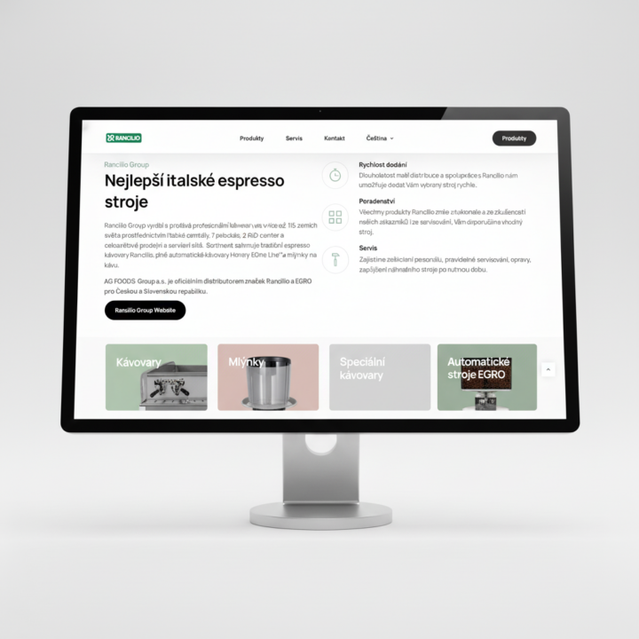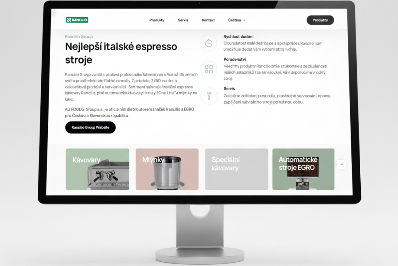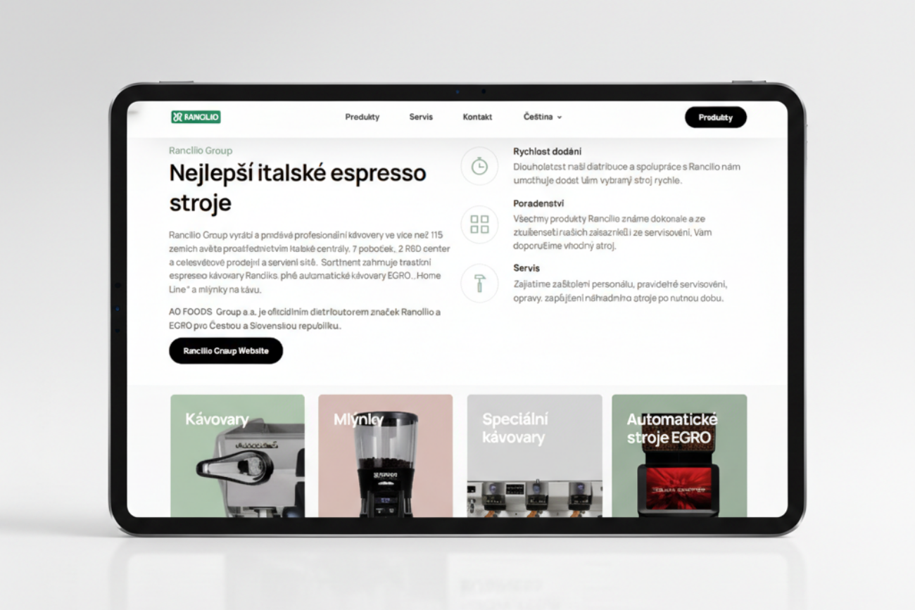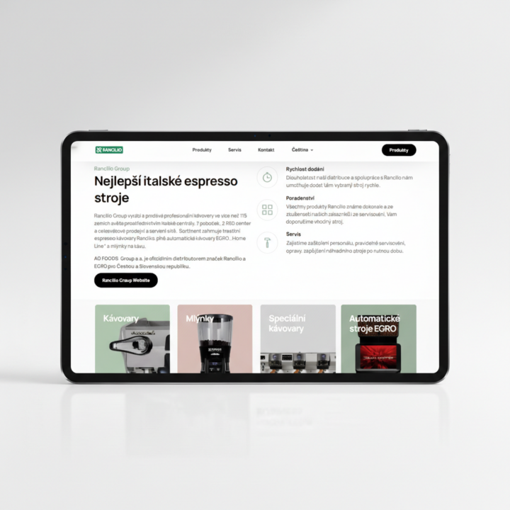 Pro oficiálního distributora italských kávovarů Rancilio a Egro (skupina AG FOODS) jsme realizovali reprezentativní webovou prezentaci. Cílem bylo vytvořit digitální prostor, který odpovídá špičkovému designu a technické preciznosti těchto strojů.